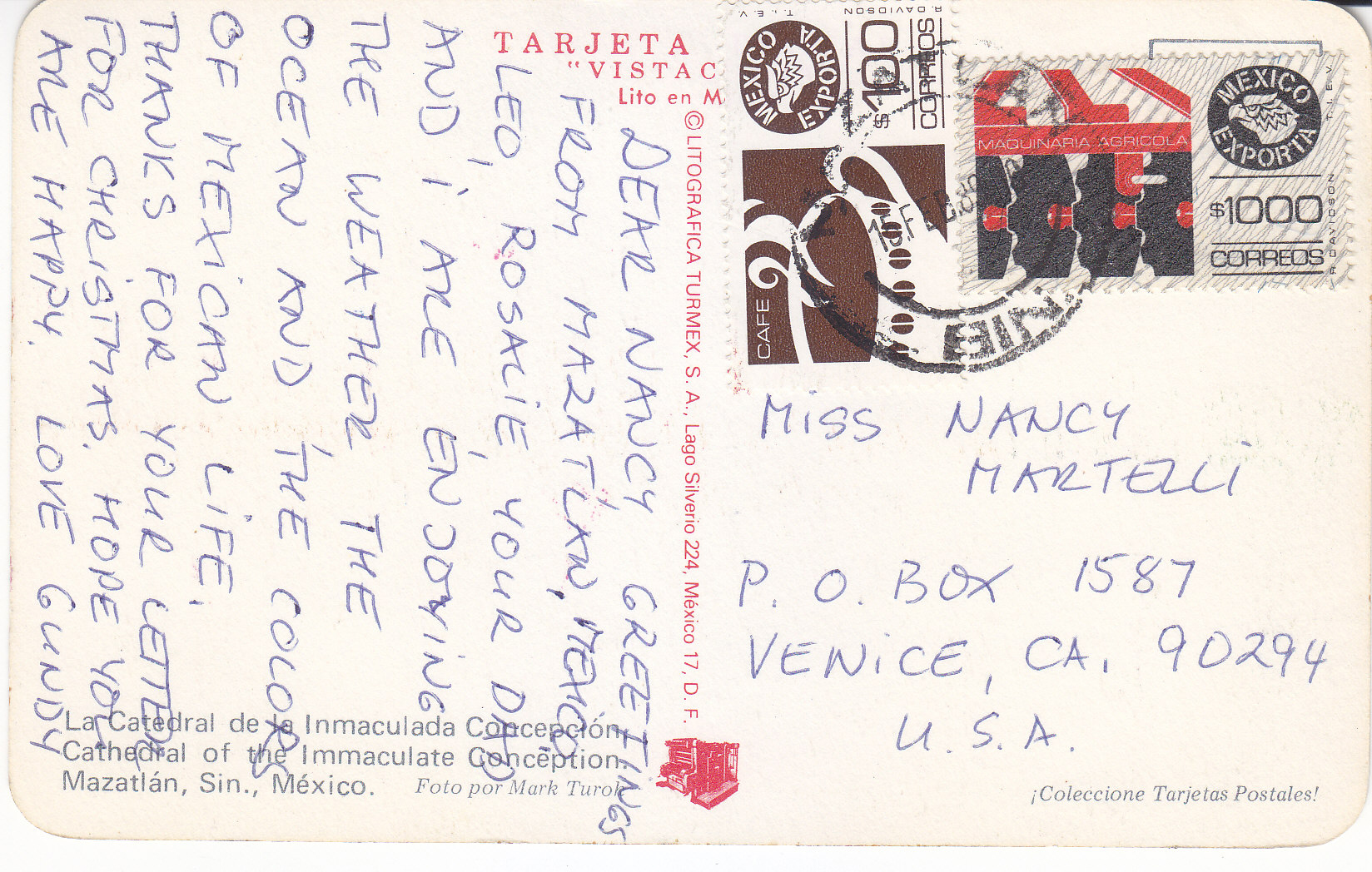 POSTCARD #331 Cathedral of the Immaculate Conception. Mazatlán [Sinaloa, México]. Foto por Mark Turok. Tarjeta Postal Vistacolor. Lito en México. Litografica Turmex, S.A. Lago Silverio 224, México 17, D.F.Coleccione Tarjetas Postales! 5.5" x 3.25" EXC