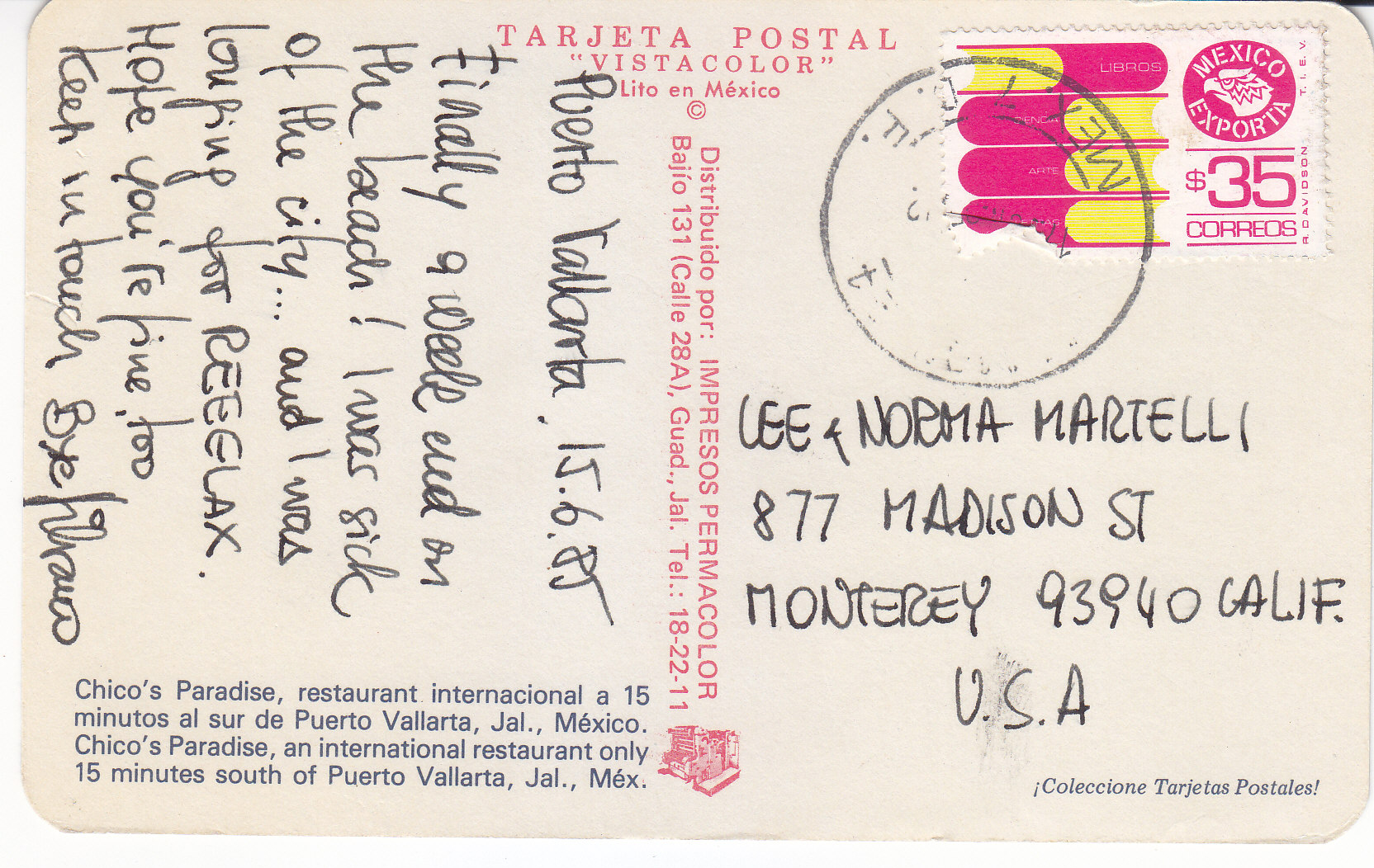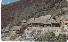 POSTCARD #332 Chico's Paradise, restaurant internacional a 15 minutos al sur de Puerto Vallarta [International Restaurant 15 minutes south of Puerto Vallarta, Jalisco, México]. Tarjeta Postal Vistacolor. Lito en México. Distribuido por: Impresos Permacolor. Bajío 131 (Calle 28A), Guad., Jal. Tel.: 18-22-11.Coleccione Tarjetas Postales! 5.5" x 3.25" EXC