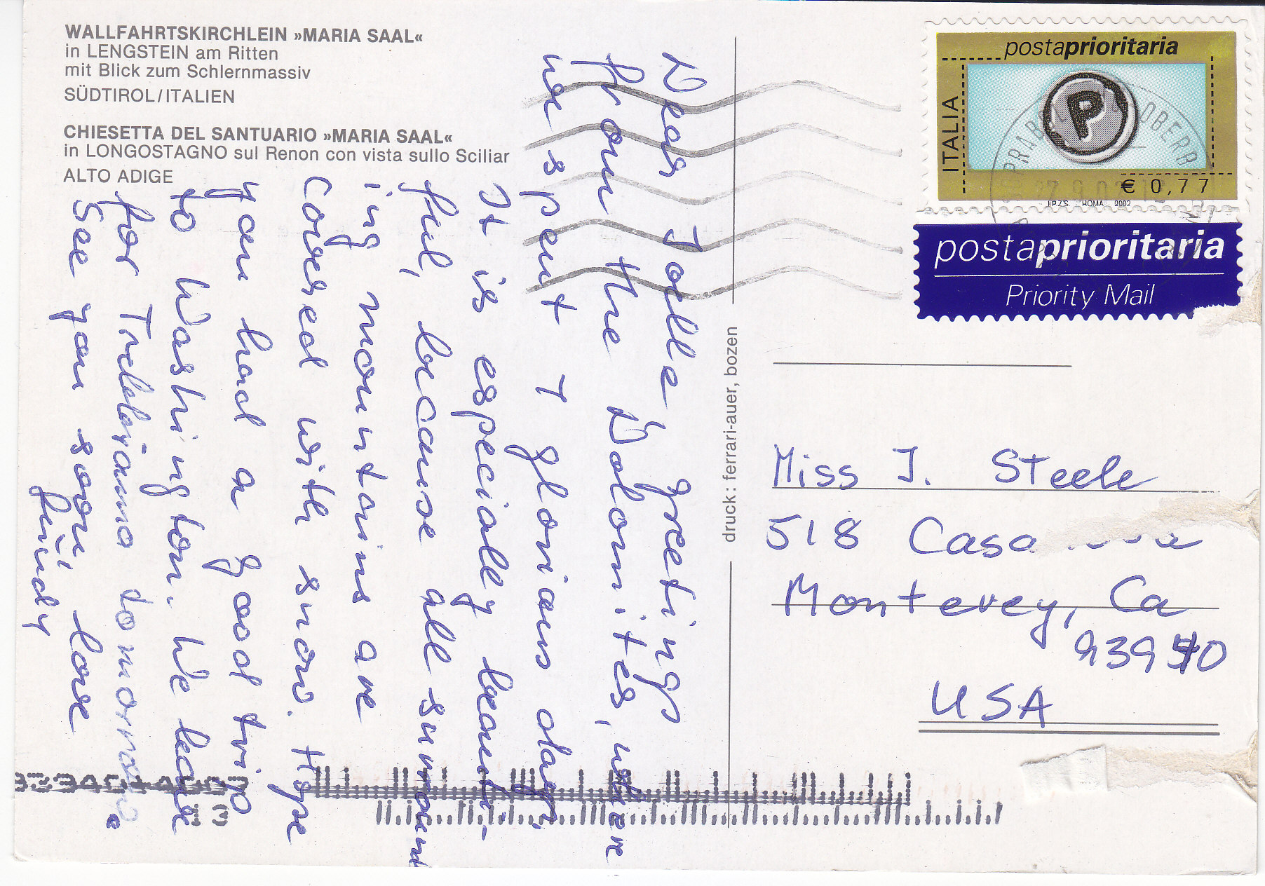 POSTCARD #335 Chiesetta del Santuario Maria Saal in Longostagno sul Renon con vista sullo Sciliar Alto Adige [Little Church of the Sanctuary of Maria Saal in Longostagno on the Renon Plateau with a view of Mt. Sciliar and the upper Adige River]. Longostagno, South Tirol, Italy. Druck: Ferrari-Auer, Bozen. 6" x 4" EXC