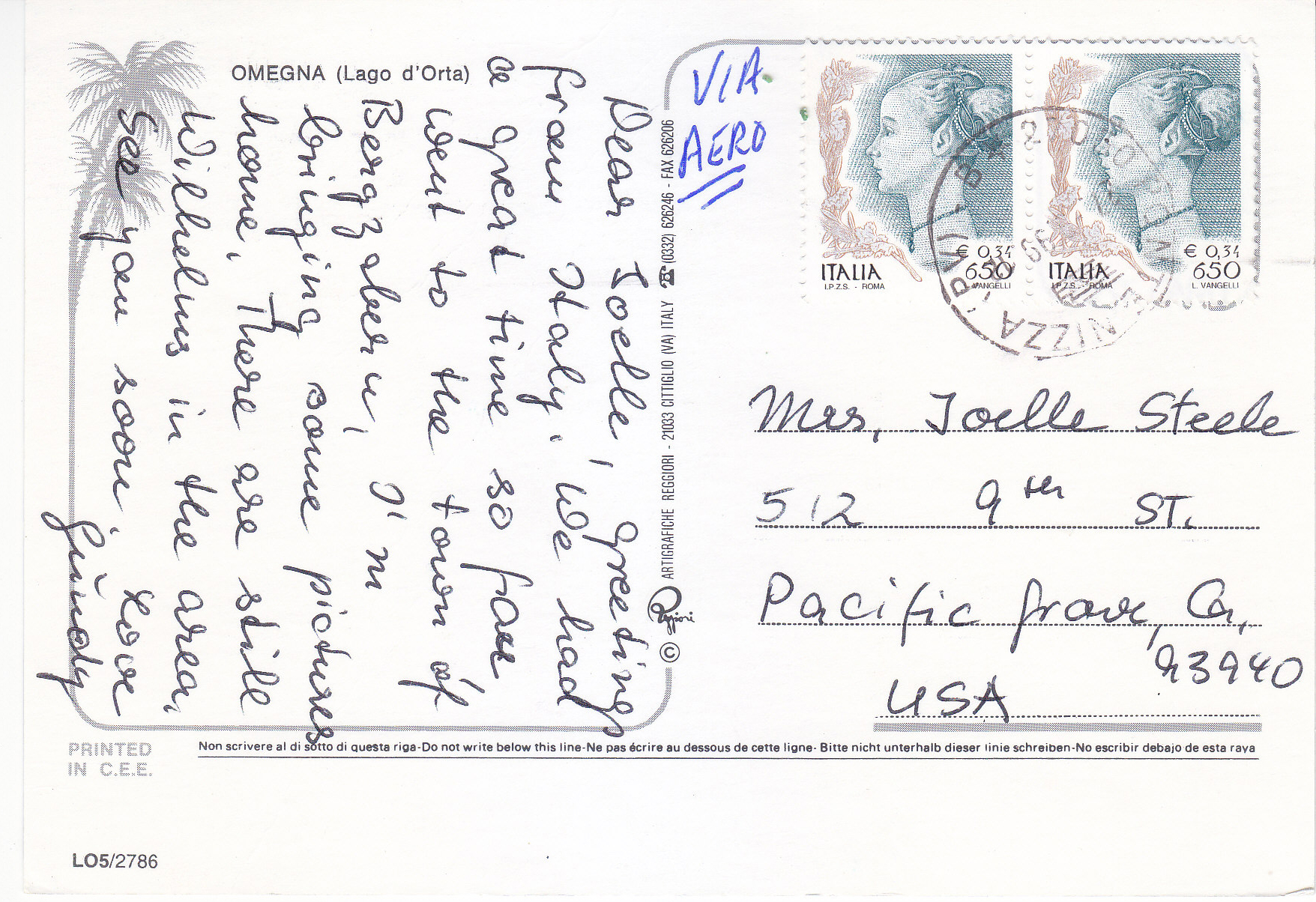 POSTCARD #336 Town of Omegna and Lago d'Orta [Italy]. LO5/27/86. Printed in C.E.E. ©Artigrafiche Reggiori. 21033 Cittiglio (VA) Italy. (0332) 626246 Fax 626206. 5.75" x 4" EXC
