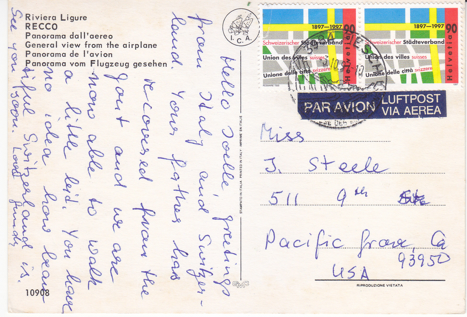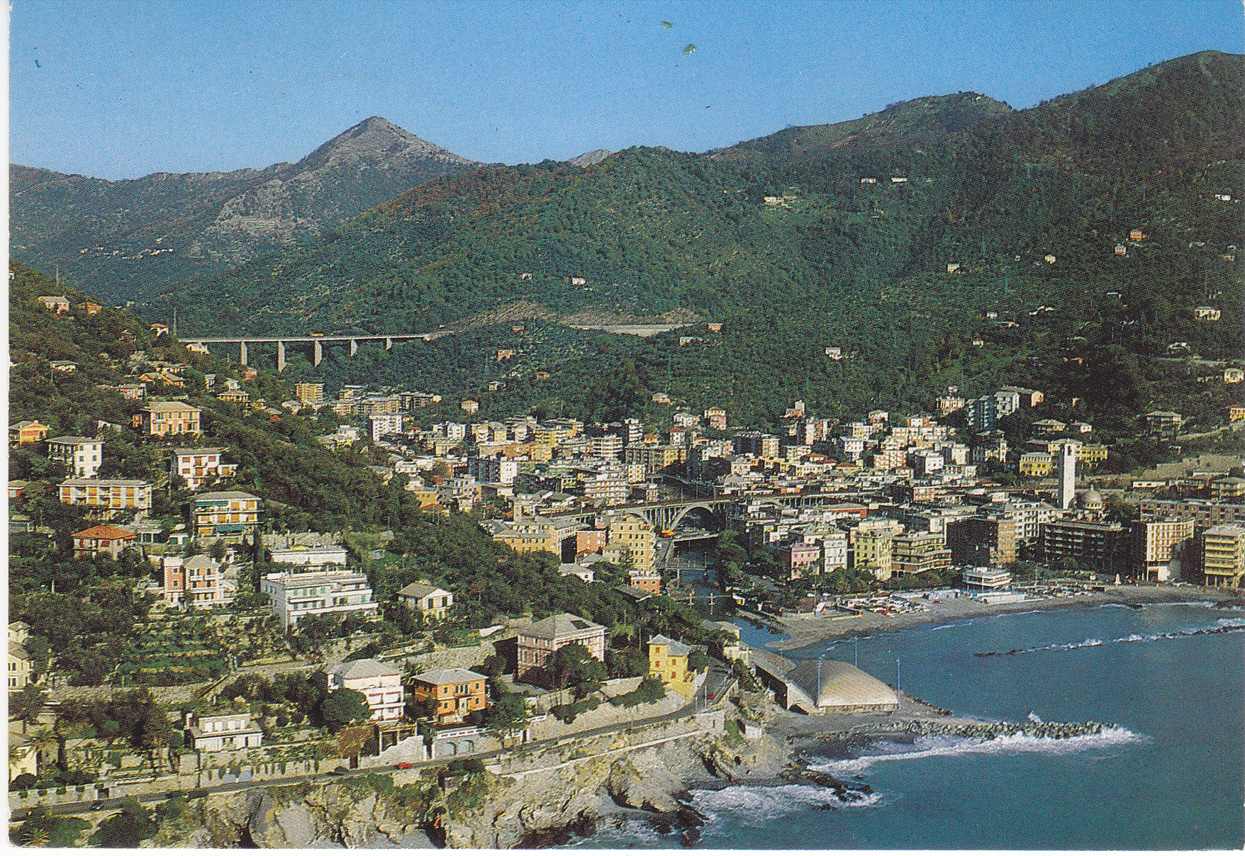 POSTCARD #337 Aerial View, Riviera Ligure, Recco [Italy]. 10908. I.C.A.Stampato in Italia. Printed in Italy. Imprime en Italie. Riproduzione Vietata. 5.75" x 4" EXC
