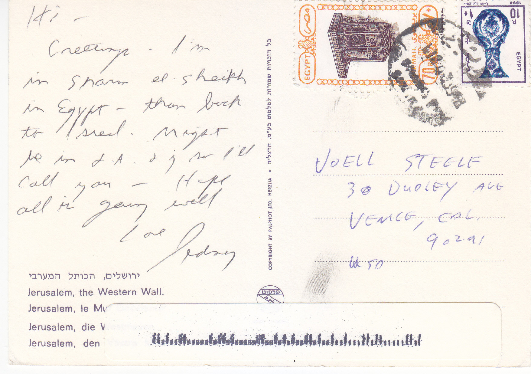 POSTCARD #174 Viddolovo za Six St., Jerusalem [Israel]. 534. Printed in the Holy Land. 5.75" x 3.75" EXC