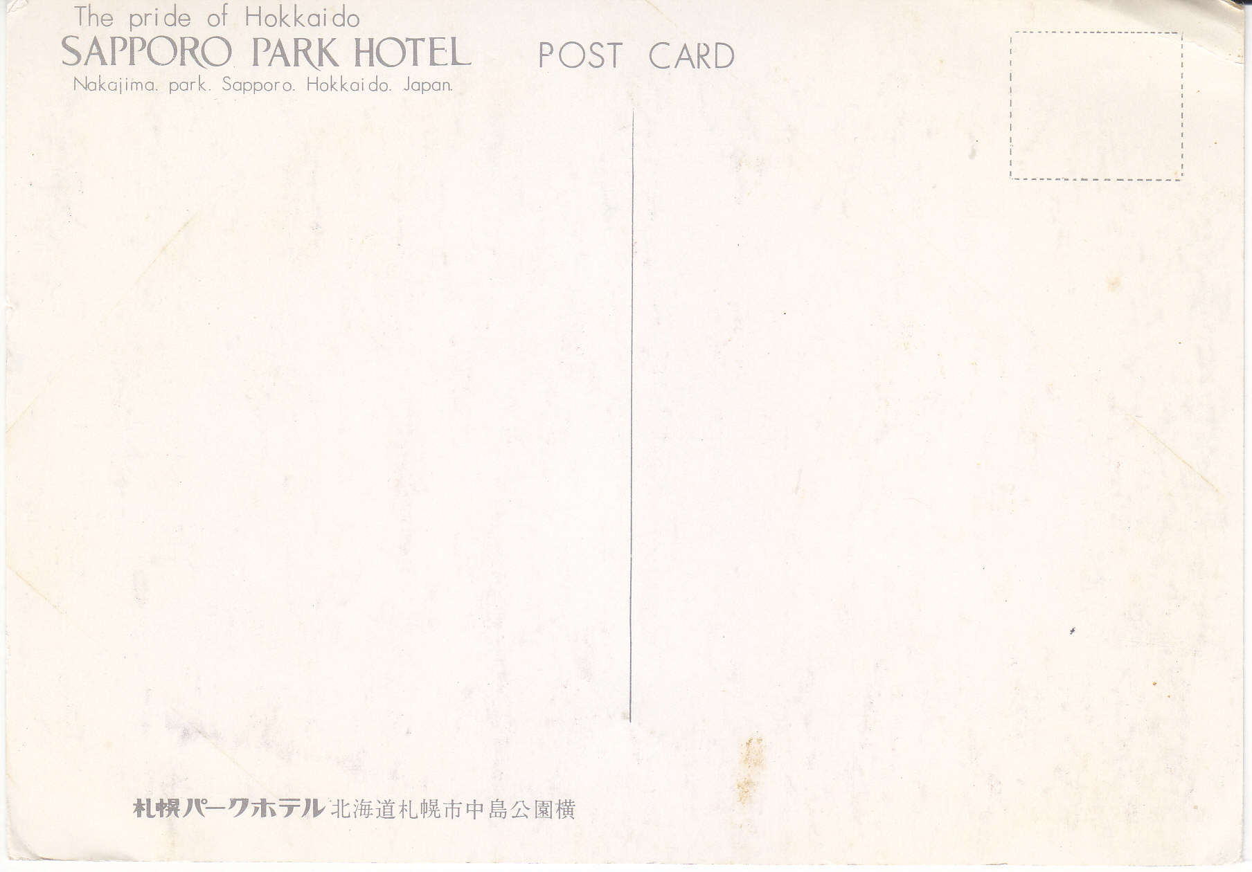 POSTCARD #354 The Pride of Hokkaido, Sapporo Park Hotel, Nakajima Park, Sopporo, Hokkaido, Japan. [Other writing is in Japanese]. 6" x 4" GD