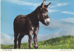 POSTCARD #084 An Irish Donkey. Photo: Joan Willis, John Hinde Studios. John Hinde Original. An Irish Donkey: The origin of this sturdy animal is found in the Sahara area of Africa from where it was brought to Ireland more than 700 years ago. To-day the donkey still plays his part on many of the smaller farms in the country, taking milk to the creamery and drawing turf from the bog and even in some cases providing a means of transport for the farmer on market day. There are approximately 75,000 donkeys in Ireland at present. Printed and Published by John Hinde Limited, Cabinteely, Co. Dublin, Irish Republic. 5.75" x 4.25" VG