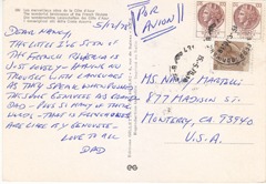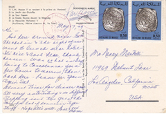 POSTCARD #287 Rabat, Maroc [Morocco]. Center: S.M. Hassan II se rendant à la prière du Vendredi [S.M. Hassan going to morning prayer]; Upper Left: Le Jardin des Oudaïas [Garden of the Oudaïas, also spelled Udayas after the Arabic tribe that built the temple/mosque]; Lower Left: La Tour Hasson [Hasson Tower]; Upper Right: La Garde Royale devant la Mosquee [Royal Guard in front of the Mosque]; Lower Right: Le Mausolee Mohamed V [the tomb of Mohamed V]. Souvenir du Maroc. Ittahcolor. Couleurs Naturelles. Photo: Ittah. 3 rue Ibn Batouta, Casablanca [Morocco]. Tel. 714-01. Reproduction Interdite. 5.75" x 4" GD