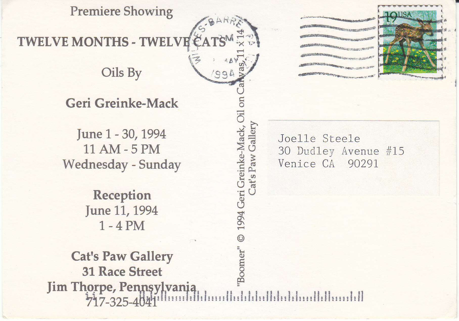 POSTCARD #087 Premier Showing. Twelve Months-Twelve Cats. Oils by Geri Greinke-Mack. June 1-30, 1994, 11 a.m. - 5 p.m., Wednesday-Sunday. Reception June 11, 1994, 1-4 p.m. Cat's Paw Gallery, 31 Race Street, Jim Thorpe, Pennsylvania, 717-325-4041. Boomer, copyright 1994 Geri Greinke-Mack, Oil on Canvas, 11 x 14, Cat's Paw Gallery. 6" x 4.5" VG