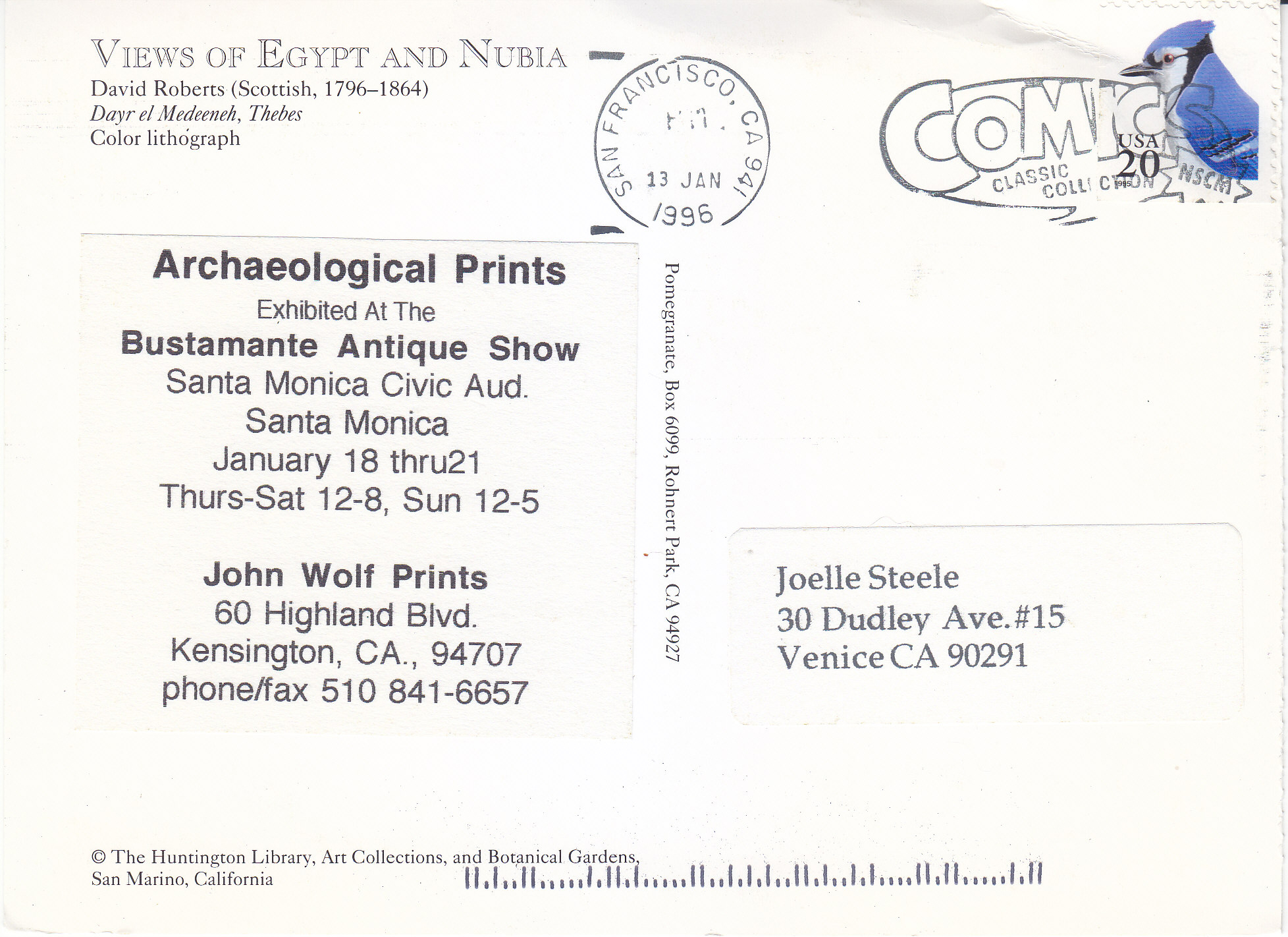 POSTCARD #186 Temple of Deir el Medineh in Thebes, 1838, from Views of Egypt and Nubia, by David Roberts (Scottish, 1796-1864), Copyright The Huntington Library, Art Collections, and Botanical Gardens, San Marino, California. Color Lithograph. Deckled edge on left of image due to being torn out of a booklet. 6.5" x 4.75" GD