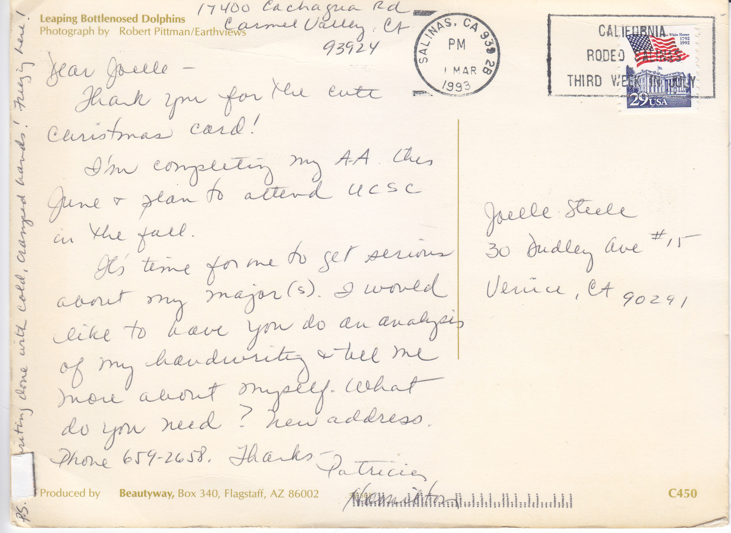POSTCARD #189 Leaping Bottlenosed Dolphins. Photograph by Robert Pittman/Earthviews. Produced by Beautyway, Box 340 Flagstaff, AZ 86002. C450. 8" x 6" GD