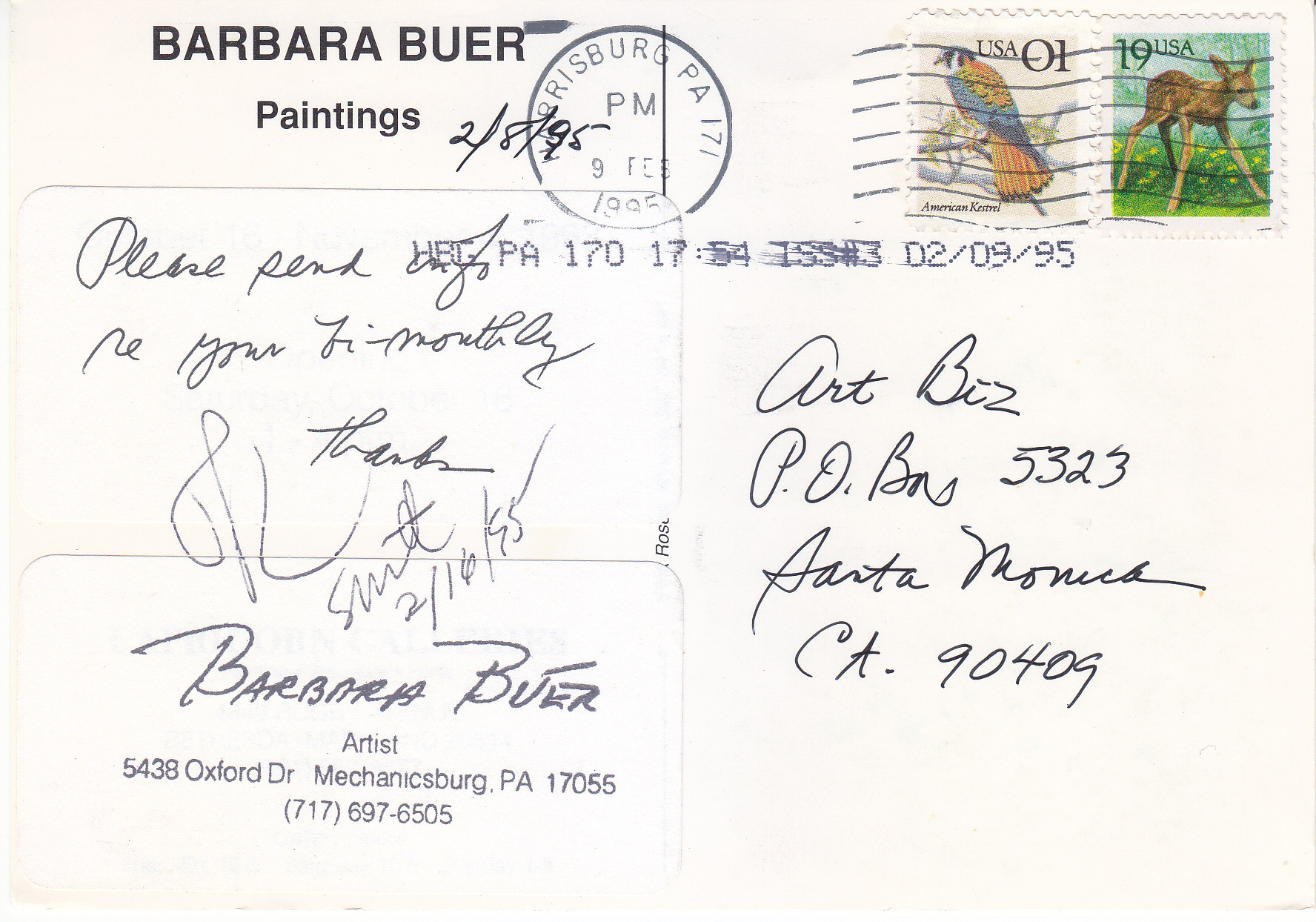POSTCARD #201 Barbara Buer Paintings. Printed information obscured by mailing labels on message side of card. 4.25" x 5.75" EXC
