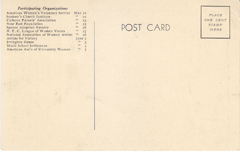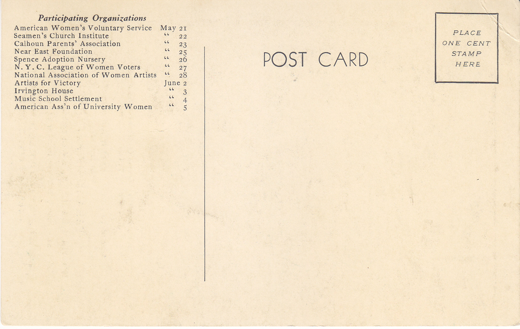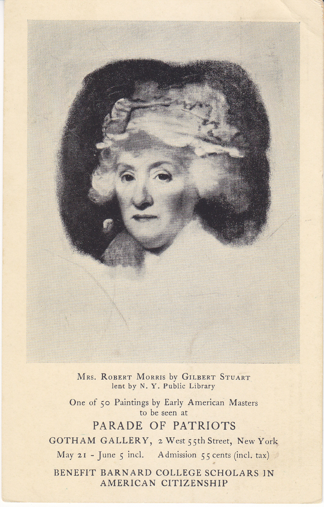 POSTCARD #376 Mrs. Robert Morris by Gilbert Stuart lent by N.Y. Public Library. One of 50 Paintings by Early American Masters to be seen at Parade of Patriots. Gotham Gallery, 2 West 55th Street, New York [New York City, New York]. May 21-June 5 incl. Admission 55 cents (incl. tax). Benefit Barnard College Scholars in American Citizenship. Participating Organizations: American Women's Voluntary Service (May 21); Seamen's Church Institute (May 22); Calhoun Parents' Association (May 23); Near East Foundation (May 25); Spence Adoption Nursery (May 26); NYC League ofWomen Voters (May 27); National Association of Women Artists (May 28); Artists for Victory (June 2); Irvington House (June 3); Music School Settlement (June 4); American Ass'n of University Women (June 5). 3.5" x 5.5" VG