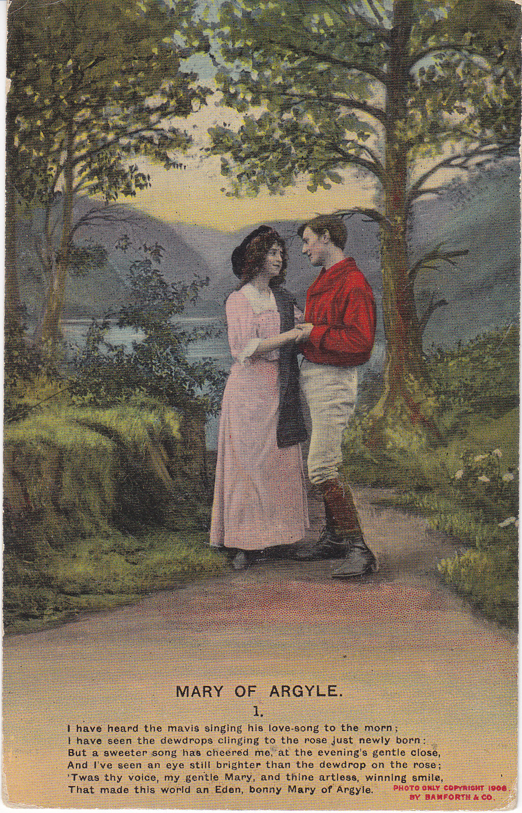 POSTCARD #398 Mary of Argyle. 1. I have heard the mavis singing his love-song to the morn; I have seen the dewdrops clinging to the rose just newly born; But a sweeter song has cheered me, at the evening's gentle close, And I've seen an eye still brighter than the dewdrop on the rose; 'Twas they voice, my gentle Mary, and thine artless, winning smile, That made this world an Eden, bonny Mary of Argyle. Photo only copyright 1908 by Bamforth & Co Holmfirth. Bamforth & Co. Publishers. England and New York. Series No. 4510/1. Printed in England. 3.25" x 5.25" VG