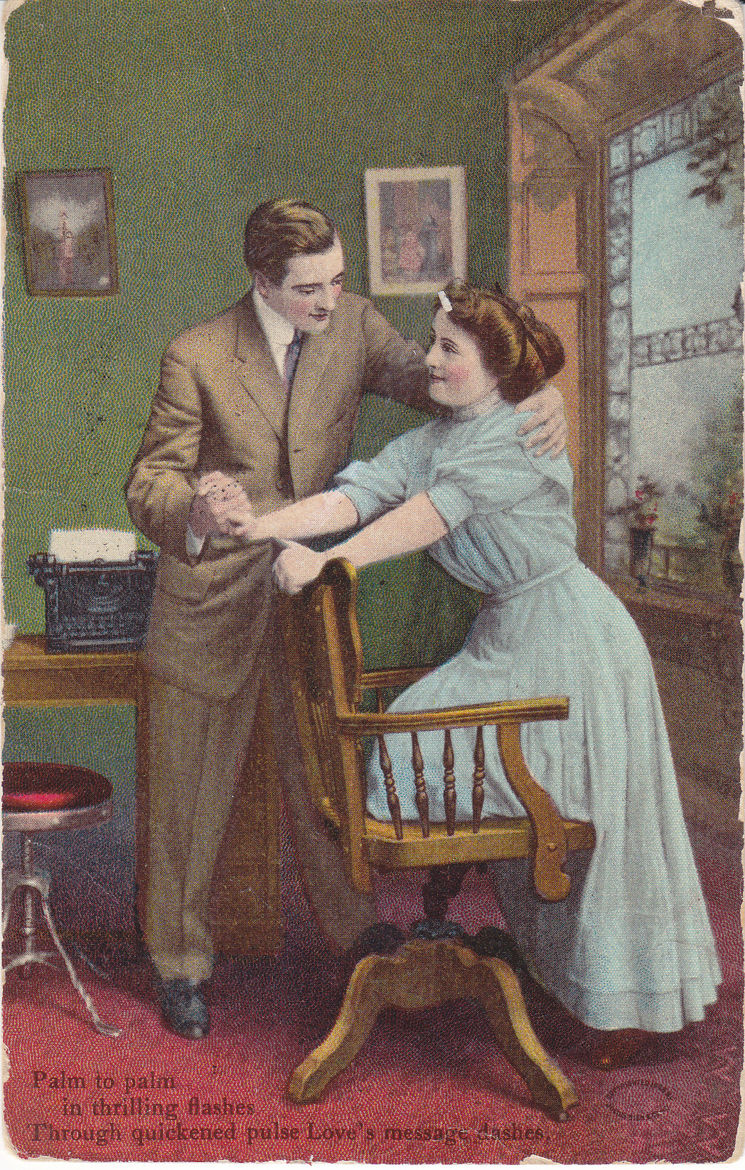 POSTCARD #400 Palm to palm in thrilling flashes, Through quickened pulse Love's message dashes. Typewriter Series Number 202-(3). Published by Julius Bien & Company N.Y. [New York]. 5.5" x 3.5"GD