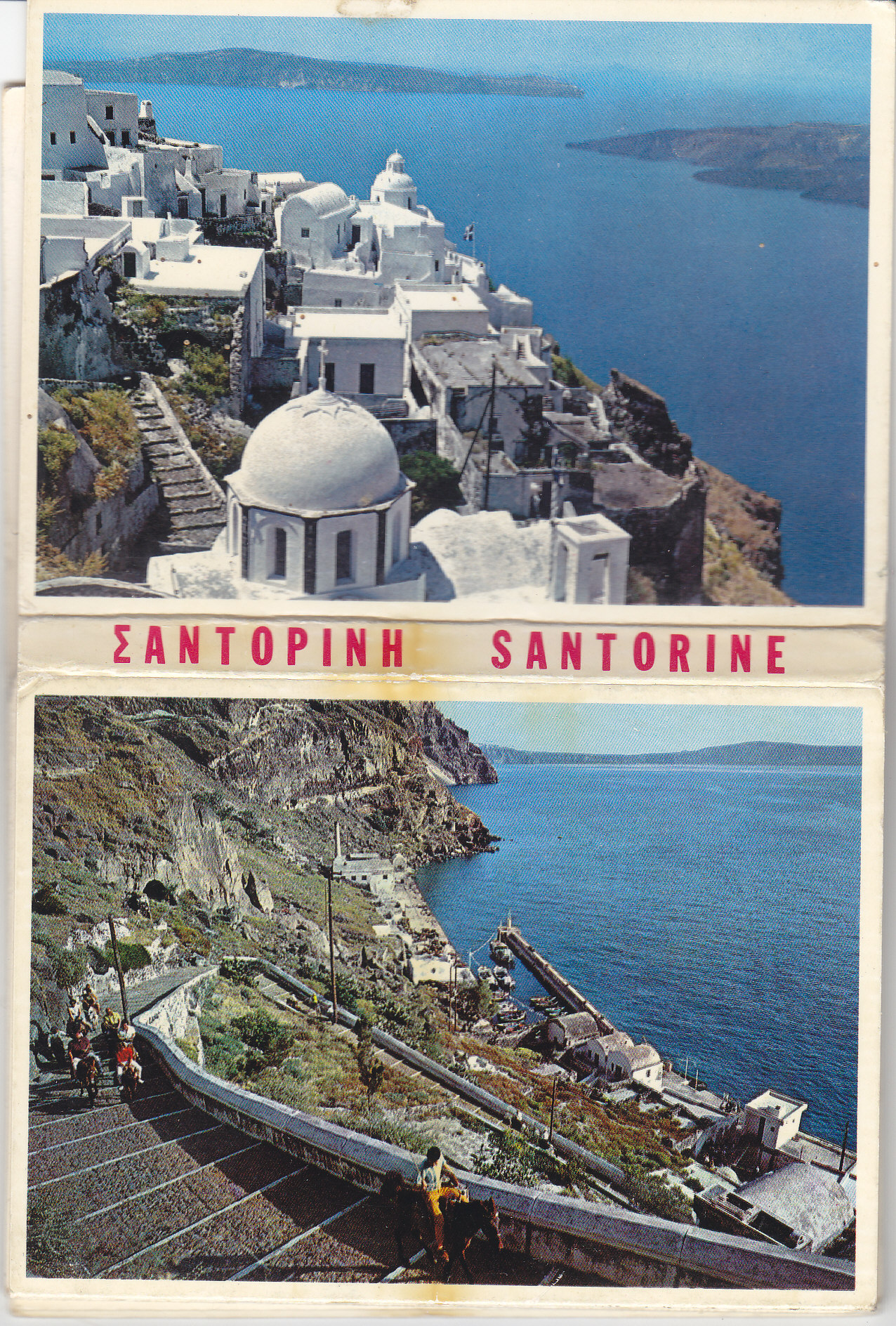 POSTCARD #990 Santorine [Greece]. Publisher name in Greek. Each card is 4" x 3". 12 images: Partial View of Phira; The port and the way to Phira; The port, the road and the town of Phira; The Port; Partial view of the Fira; The steep, shore, the port and the way to Fira; Partial view of Thyra; Partial view of Phira; The church of Panagia the Episcopi; Partial view of Oia; The picturesque streets; On the way to Fira. Image sides are EXC, but back sides have some stains, and the cover is a little worn.