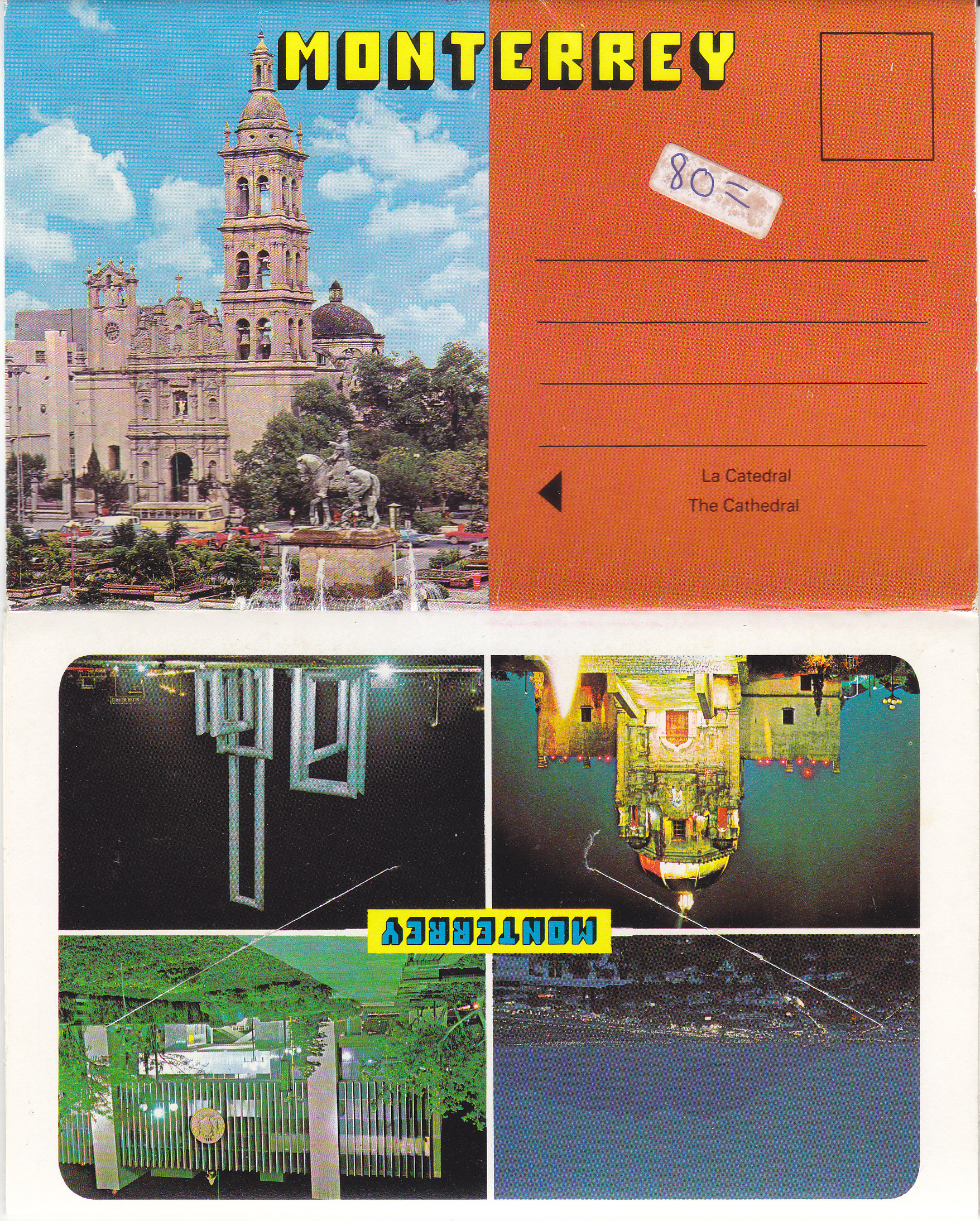 POSTCARD #992 Monterrey [México]. Each card is 5.75" x 3.75". 14 images (7 cards, images on both sides): The Cathedral; 4 individual images of the sights; Constitution Ave. Underpass; Monument to the Nations in Guadalajara Park; La Purisima Church; The House of Culture; Panoramic view of the city from the Bishopric; Sunrise with Saddle Hill; Air view of the Technological Institute; The State Capitol and Heroes Esplanade; The Pedestrian Mall on Morelos Street; Panoramic night view of the City; The Horsetail Waterfall; City Hall and Monument to Gral. Zaragoza. Impreso por Litografica Turmex, S.A., Lago Silverio No. 224, México, D.F., 11320. Representaciones "TOMA", Amazonas 15, Pte. (Valle), Tel. 56-82-54. 916.29. All images are EXC, but the flap of the envelope has a very tiny tear, and the last card has a slight wrinkling.