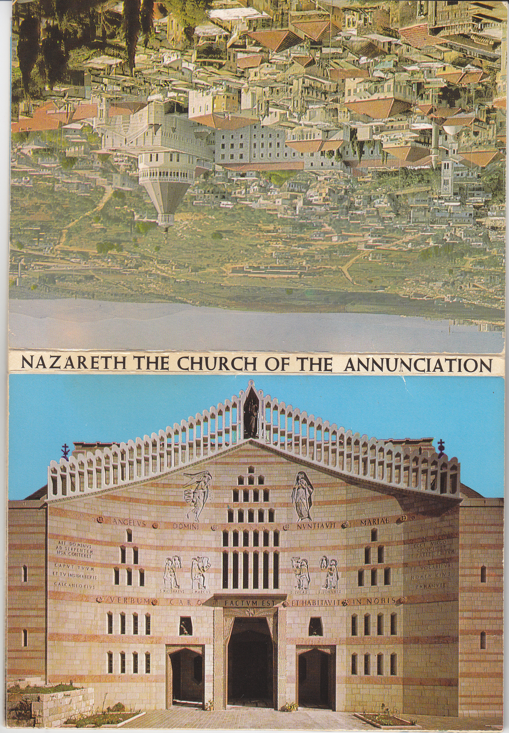 POSTCARD #996 Church of the Annunciation, Nazareth [Israel]. Each card is 5.75" x 4". 10 images: Church with partial view of Nazareth (9061); The Incarnation Facade (9075); General View of the Venerated Grotto (9095); Central Mosaic (9062); Pavement of the Upper Church (9078); The Presbytery (9064); Inside of the Baptistery (9081); Big Western Window (9069); The Church (9228); Inside of the Upper Basilica (9227). Copyright by Palphot. Printed in the Holy Land. Made in Israel. All images and reverse sides are EXC, with a little wearing of the edges of the cover.
