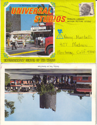 POSTCARD #994 Universal Studios, Hollywood, California. LAF-394. ©1968 Universal City Studios, Inc., Universal City, CA 91608. A Mike Roberts Color Production, Berkeley, CA 94710. Each card is 6" x 4". 14 images (7 cards with images on both sides): Cover photo of entry; Starting Tour on GlamorTram; Stuntmen in Action; The Phantom and his Visiting Friends; Scenic Lagoon at Prop Plaza; Ma and Pa Kettle's Animal Farm; Star's Dressing Room; Stuntmen in Action Arena; Naval Battle in Miniature on Lagoon; Winter ... Every Day on Universal's Snow Set; Watching Shooting on a Western Street Set; Prop Plaza-The Halfway Point; European Street on Universal's Back Lot; Panoramic View from Visitor's Center. All images are EXC, except for one card which is somewhat wrinkled, and the cover is somewhat worn.