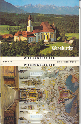 POSTCARD #995 Wieskirche [Wies Pilgrimage Church, Steingaden, Germany]. Built 1746-1754 by Dominikus Zimmermann. Dia- und Postkarteverlag Hans Huber KG., D-8100 Garmisch-Partenkirchen, Tel. 0 88 21 / 5 90 48. Eine "Huber" Karte. Eine Huber Serie. Serie 18. Each card is 5.75" x 4.25". 10 images: View against the Ammergauer and Lech Valley Alps (Nr. 8401); Nave with pulpit, high altar, and painted domed ceiling (Nr. 8719); Pulpit and Choir Loft (Nr. 8720); View from the sanctuary into the nave and organ gallery (Nr. 8721); Choir Room with the Image of the Gospel of the Savior (Nr. 8722); The Image of the Scourged Savior (Nr. 8723); Ceiling Fresco by J.B. Zimmermann 1680-1758 (Nr. 8724); Choir Room with High Altar (Nr. 8725); Statue of St. Johannis (Nr. 8702); Southern Side Altar, Brotherhood of the Scourged Savior (Nr. 8726). All images and reverse sides are EXC, with a little wearing of the cover.